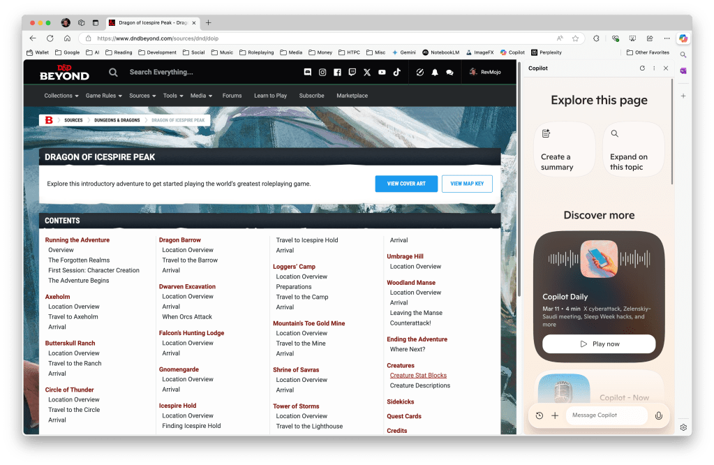 I auditioned several of the major services offering LLMs, and they all were able to aid me in my quest for better descriptive text to one degree or another. Most of the services however, required that I copy/paste the text of the entire module chapter I was working on in order to have enough context for the description to be relevant. That’s when I stumbled across Copilot in Microsoft’s Edge browser.